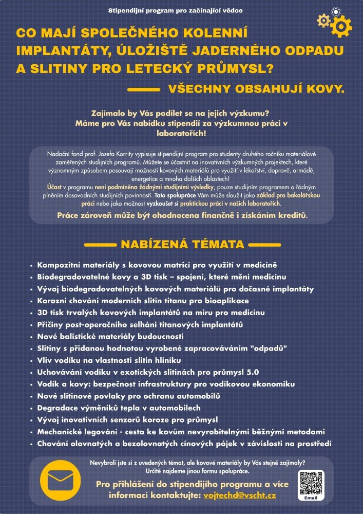 • Nadační fond prof. Josefa Koritty každoročně vypisuje stipendijní program pro studenty druhého ročníku materiálově zaměřených studijních programů. Program umožňuje studentům podílet se na aktuálně řešených výzkumných projektech, které řeší problematiku kovových materiálů v lékařství, dopravě, energetice a mnoha dalších oblastech.